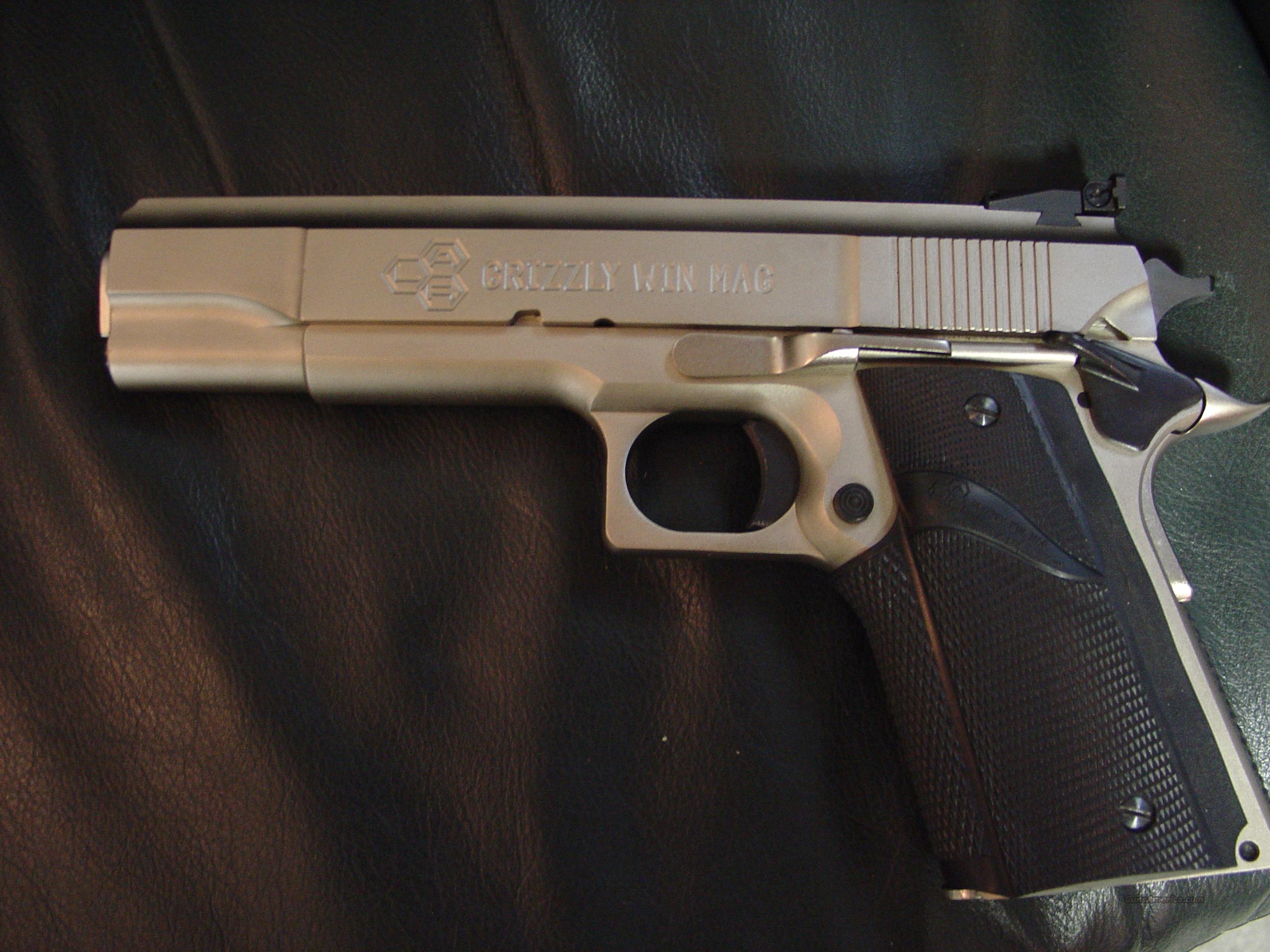 LAR グリズリー・ウィンマグ / LAR Grizzly WinMag 自動拳銃 † 19年にアメリカのLAR社が開発したマグナム オート 。 1911 をベースに 45 Win Mag という自動拳銃用の45口径マグナム弾を用いる珍しい拳銃である。 強力なマグナム弾を発射するため、リコイル グリズリー ウイン マグのトイガンは、現在に至るまでグンゼ産業のエアコッキングガンが唯一の製品である。 1911がベースになっているが、実銃は45ウインチェスターマグナムという強力なカートリッジを使うため、全体的にふたまわり以上大型化して